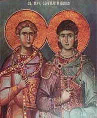 Ови свети и дивни мученици и јунаци вере Христове беху најпре први великаши на двору цара Максимијана. И сам их цар уважаваше много због храбрости, мудрости и верности. Али кад чу цар, да су ова два великаша његова хришћани,...