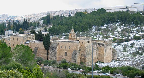 Манастир се налази 2 км од источних зидина Јерусалима и у непосредној близини Израелског парламента. По предању је након што је Бог сумпором сагорео градове Содом и Гомор поштедио је једино праведног Лота и његову породицу. Напуштајићи их понео је три семена од три дрвета – кедра, шимшира и кипариса. Три дрвета су расла тридесет година тако близу једно другог да су у бити била једно. Троједно дрво је посечено за грађу обновљеног Соломоновог храма али како се није дало обрадити, као уклето је бачено у Кедронски поток где је било пуних 30 година и тад је одлучено да на њему уклетом разапну и још више осрамоте Исуса Христа, а дрво се тек тада дало обрадити. Крст Господњи био је отприлике 3.5м са 2м и дебљине 12цм.