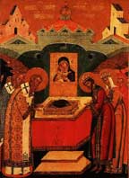 Положење ризе пресвете Богородице у цркву Влахернску у Цариграду. За време цара Лава Великог (458- 471.), царице Верине и патријарха Генадија, путоваху по Светој Земљи два племића цариградска, Галвије и Кандид, ради поклоњења тамошњим светињама. У Назарету одседну у кући неке девице Јеврејке, која држаше у тајној одаји ризу пресвете Богородице. Многи болесници и невољници добијаху исцелење од својих мука молитвом и додиром те ризе. Галвије и Кандид узму ту светињу и пренесу у Цариград, и објаве то цару и патријарху. То изазове велику радост уцарскоме граду. Риза буде свечано пренета и положена у цркву Влахерне. (Ова црква сазидана је од цара Маркијана и Пулхерије на обали једног залива, званог Влахернски, по имену некога Скитског војводе Влахерна, који је ту био убијен). И за спомен положења ризе пресвете Богородице у цркву Влахернску установљен је овај празник.