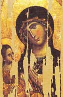 разник иконе Одигитрије. Ову је икону радио на дрвету сам јеванђелист Лука. Њу је видела Пресвета Богородица и благословила је. Ту икону свети Лука подарио је державном Теофилу, за кога је писао Дела светих апостола. Из Антиохије икона се доцније пренесе у Јерусалим, а из Јерусалима узме је царица Евдокија и пошаље у Цариград царевој сестри, побожној Пулхерији, на дар. Пулхерија је положи у Влахерну цркву, своју сопствену задужбину. Једанпут се јави Пресвета Богородица двојици слепаца и доведе их у цркву Влахерну, пред Своју икону, и ту им обојици поврати вид. Због тога ту икону прозваше Одигитрија – Путевођа. Када војске персијског цара Хозроја и скитског Кагана ударише на Цариград, патријарх Сергије изнесе ову икону на бедеме градске, и ношаше је по бедему. И Пресвета Богородица тада спасе хришћане од нехришћана. Збунише се војске непријатељске, море се усколеба,