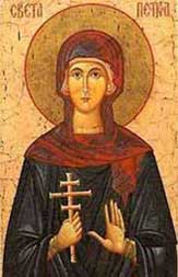 Ова славна угодница Божија роди се у граду Епивату (Пиват – по турски Бојадис), који се налазише између Силинаврије и Цариграда. Она беше српског порекла, из имућне и веома побожне породице. Имала је брата, који се звао Јевтимије, и који се замонашио веома млад, а касније би изабран за епископа Мадитског. Још као девојчица, док је са мајком одлазила у цркву и чула речи Божанског Јеванђеља:“Ко хоће за мном да иде нека де одрекне себе и узме крст свој и за мном нека иде“ (Мк. 8,34), она свим срцем припаде Господу и када одрасте придружи се плејади благочестивих угодника Божијих. Након смрти својих родитеља, ова света девица жељна подвижничког живота напусти родитељски дом и оде у Цариград, а затим се запути у пустињу Јорданску, где се Христа ради подвизавала све до старости своје. У доба позне старости послуша глас Анђела Божијег, остави пустињу и врати се у свој родни град, Епиват. Ту она поживе још две године у непрестаном посту и молитви, па се представи Богу у 11 столећу. Њено тело би од стране верних сахрањено по хришћанским обичајима, али не на градском гробљу већ издвојено од других. По промислу Божјем, који хтеде да прослави угодницу своју, откри њене свете мошти после много година и то на веома чудесан начин. Њене чудотворне мошти преношене су у току времена много пута. Најпре у Цариград, па одатле у Трново, да би опет биле враћене у Цариград, а из Цариграда у Београд. Сада се свете и чудесне мошти, Свете петке налазе у румунском граду Јашу. У Београду се налази чудотворна и лековита вода (агаизма) ове светитељке, која лечи све болеснике, који са вером у Бога и љубављу према овој светитељки прилазе к њој.