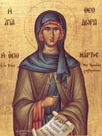 Из Александрије, жена младога мужа. Наговорена неком врачаром она учини прељубу с другим неким човеком. И одмах је поче савест љуто гристи. Ошиша се и обуче у мушко одело, па ступи у мушки манастир Октодекат под мушким именом – Теодор. Њен труд, пост, бдење, понизност и плачно покајање задивили су сву братију. Оклеветана од неке блудне девице, као да је с њом затруднела, Теодора се није хтела правдати сматрајући ту клевету као казну Божју за свој ранији грех. Изгнана из манастира она 7 година проведе пребијајући се по шуми и пустињи, и још уз то негујући дете оне блуднице. Победила сва вражја искушења: није се хтела поклонити сатани, није хтела примити јело из руку једног војника, није хтела слушати савете свога мужа да се врати к њему – јер све је то био само призрак ђаволски, и чим се Теодора прекрстила крстом, све је ишчезавало као дим. После 7 година прими је игуман у манастир, где проживе још 2 године, па се упокоји у Господу. Тек тада познаше монаси, да је то била жена; а игуману се јави ангел и објасни му све. Њен муж тада дође на сахрану, и оста до смрти у келији своје бивше жене. Св. Теодора имаше превелику благодат Божју: зверове укроћаваше, болести исцељаваше, воду у сухом бунару изведе. Тако Бог прослави истинску покајницу, која са јуначким трпљењем 9 година кајаше само један свој грех. Упокојила се 490. год.