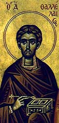 Беше најпре у манастиру светог Саве Освећеног, но после се настани на неком гробљу многобожачком, чувеном због појава злих духова и страшилишта. Да би победио страх у себи вером у Бога, Талалеј се настани на том гробљу где проживе многе године, претрпевши много од напада духова и дању и ноћу. Због велике вере у љубави према Богу дарова му Бог дар чудотворства, те учини многа добра болесним и страдалним људима. Скончао око 460. године.