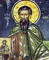 Као негда Ана мајка Самуилова тако и Ана мајка Стефанова мољаше се Богу, да јој Бог да једнога сина. Молећи се тако једном у цркви Влахерни пред иконом Пресвете Богородице, ухвати је лак сан, у коме она виде Пресвету Деву, као сунце сјајно, и чу глас од ње: „иди, жено, с миром, према молитви твојој имаш сина у утроби твојој.” И заиста заче Ана и роди сина, овога светога Стефана. У 16. години прими Стефан чин иночки на гори Аксентијевој према Цариграду од старца Јована, од кога се научи мудрости божанској и подвижништву. А када се старац Јован упокоји у Господу, Стефан оста на тој гори строго подвизавајући се и прилажући труд ка труду. Његова светост привуче му многе ученике. Када цар Константин Копроним прогоњаше иконе, још жешће од свога сквернога оца, Лава Исаврјанина, Стефан се показа као ревносни заштитник поштовања светих икона. Безумни цар примаше разне гнусне клевете против Стефана, а и сам удешаваше разне сплетке, само да би Стефана сломио и с пута уклонио. Стефан би прогнан на острво Проконис, по том доведен у Цариград, окован и бачен у тамницу, где га сретоше 342 монаха сужња, из разних страна доведених и у тамницу због иконопоштовања вргнутих. У тамници они свршаваху све црквено правило као у манастиру. Опаки цар осуди Стефана на смрт. Светитељ предвиде своју смрт на 40 дана и опрости се с братијом. Слуге цареве извукоше га из тамнице и бијући га и трзајући вукоше га по улицама Цариградским призивајући све оне, који су уз цара, да ударају камењем „противника царева”. Неко од јеретика удари дрветом светитеља по глави, и светитељ издахну. Као што св. Стефан првомученик пострада од Јевреја тако и овај Стефан пострада од иконоборних јеретика. Пострада овај славни Христов војник 767. године у 53. год. свога земнога живота, и би увенчан славом неувелом.