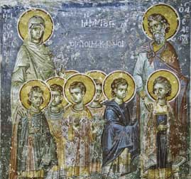Пострадаше сви за чистоту вере Израиљске од цара Антиоха званог од једних Епифанос (просветљени), а од других Епиманис (безумни). Због великих греха у Јерусалиму, а нарочито због отимања око власти архијерејске, и злочина, учињених приликом тог отимања, попусти Бог велику беду на свети град. Антиох хтеде пошто по то да наметне Јеврејима идолопоклонство јелинско на место вере у једнога живога Бога, и чињаше све у томе правцу. Помагаху ту његову мисао и неки вероломни архијереји и друге старешине јерусалимске. Једном дође сам цар у Јерусалим и нареди, да сви Јевреји једу свињско месо, противно закону Мојсијеву. Јер једење свињског месабеше очигледан знак, да се неко одрекао вере Израиљске. Старац Елеазар, свештеник и један од седамдесет преводиоца Старог Завета на грчки језик, не хте јести свињског меса. За то бимучен и у огњу спаљен. Враћајући се у Антиохију цар узе собом седам синова, званих Макавеји, и мајку њихову Соломонију. Седам браће Макавеја зваху се: Авим, Антонин, Елеазар, Гурије, Евсевон, Алим и Маркел. На очи мајке опаки цар мучаше једног по једног сина, дерући свакоме кожу с лица и бацајући их потом у огањ. Они сви храбро претрпеше муке и смрт, но вере се своје не одрекоше. Најзад и мајка, када виде и свог последњег трогодишњег сина у огњу, и сама скочи у огањ и изгори, предавши душу Богу. Сви чесно пострадаше за веру у једног живога Бога око 180 год. пре Христа.