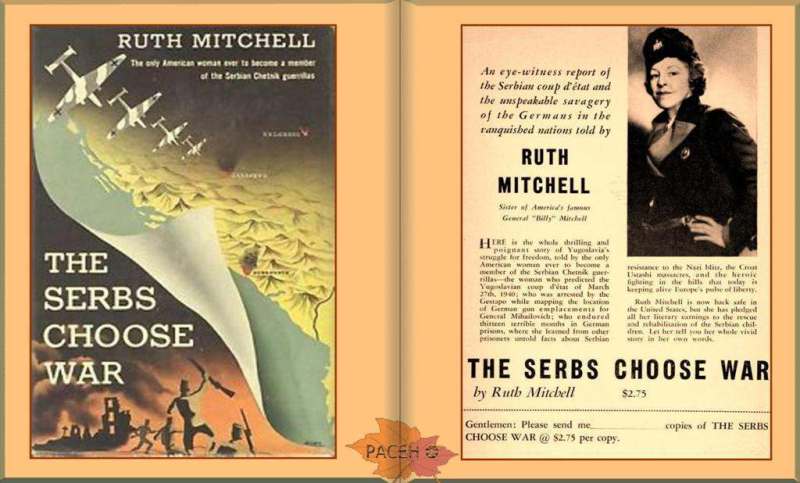 Иза пред-последњег рата издала je своје успомене једна америчка новинарка по имену Рут Мичел, која je дуго времена провела међу Србима, па чак и за време самог рата, кад je била затворена у Ратничком дому у Београду, тада тамници Гештапоа. У њеној књижици: „Четници говоре факта о српским борцима – Михаиловић и Југославија“, Мичел се изражава овако:
