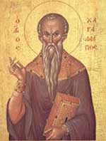 Овај велики светитељ беше епископ у Магнезији и пострада за Христа у својој стотринаестој години. Када наста страшно гоњење хришћана у време цара Септимија Севера, старац Харалампије не кријаше се од гонитеља, него слободно и јавно проповедаше веру Христову. Све муке претрпе као у туђем телу. А кад с њега жива кожу одраше, незлобиви светац рече царским војницима: „Хвала вам, браћо, за то што остругавши моје старо тело, ви обновисте дух мој за нови, вечни живот“. Многобројна чудеса учини, и многе у веру обрати. Чак и царева кћи Галина напусти незнабоштво свога оца и поста хришћанка. Осуђен на смрт и изведен на губилиште свети Харалампије уздиже руке к небу и помоли се Богу за све људе, да им Бог даде телесно здравље и душевно спасење, и да им умножи плодове земаљске. „Господе, ти знаш, да су људи месо и крв; опрости им грехе, и излиј благодат Твоју на све!“ После молитве овај свети старац предаде душу своју Богу пре него што џелат спусти мач на његов врат. Пострада 202. године. Његово тело узе Галина и чесно га сахрани