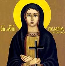 Девица знаменита рода из Антиохије. У време цара Нумеријана началник Антиохијски беше послао војнике, да доведу на суд Пелагију, као тада разглашену хришћанку. Војници опколе кућу и изазову свету девицу на врата. Она им се јави, и кад чу, да су дошли да је воде пред судију, прављаше се весела, па рече војницима, да је причекају само тренутак два док се попне да се преобуче. По том се успне на кров од куће, уздигне руке к небу, и дуго се мољаше Богу, да јој Бог прими душу и да не допусти да се оскврни њена девствена чистота. И Бог јој прими душу, а тело паде мртво пред војнике. „Смрт њена, пише св. Златоуст, била је средством не природног пада него заповести Божје“, па продужује: „и тако, ово девствено и од сваког злата чистије тело лежало је на земљи: ангели су га окружавали, архангели поштовали, сам Христос био је код њега.“