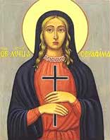 Девојка из Антиохије. Живела у дому неке Савине, сенаторке, коју приведе вери Христовој. Чувши за њу неки Вирил, мучитељ хришћана, нареди те је доведоше преда њ. Пошто Серафима оста непоколебљива у вери својој, нареди мучитељ, да се баци у тамницу, и посла неке младиће, да с њом преноће и да је оскврне. Серафима се Богу мољаше у тамници, кад младићи стигоше пред тамничка врата. Ту наједанпут забљешта пред њима ангел Божји с мачем у руци, и они падоше као мртви, потпуно несвесни и раслабљени. Сутрадан мучитељ замоли Серафиму, те молитвом поврати младиће к свести. Приписујући све ово мађијама Вирил нареди, те ову свету девицу најпре жегоше свећама, а по том је бише штаповима. Но кад њу бијаху, одломи се један комад штапа, одскочи и удари Вирила у очи, од чега он ослепи. Најзад мачем одсекоше главу овој Христовој слушкињи, и она предаде дух свој Богу. Благочестива Савина чесно погребе њено тело, од кога поче тећи исцелење многима. Пострада св. Серафима у време цара Адријана (117 – 138).