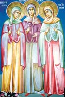 Три рођене сестре, из неког места у Витинији Азијској. Васпитане у духу хришћанском повукоше се из града у пустињу желећи да ум свој узвисе Богу и ослободе свега варљивога света, и да тако проживе век овај у чистоти и девичанству као праве невесте Христове. Предадоше се великом труду, посту и молитви, док их Бог не украси даром чудотворства. Када к њима почеше доводити болеснике ради исцелења, оне посташе знамените и преко своје воље. Чу за њих и неки кнез Фронтон и довуче их на суд. Видевши их кнез зачуди се красоти лица њихова. Јер и ако оне беху велике испоснице, и тело њихово сухо, лице им беше светло, озарено унутрашњим миром и благодаћу Божјом. Кнез им најпре ласкаше и обећаваше послати их цару, који ће их удати за своје велможе, но када се увери, да све његове ласке и обећања немаху никаква дејства на ове невесте Христа Господа, он нареди те прво мучише Минодору, а сестре њене баци у тамницу. После љутих мучења викне кнез Минодори, израњављеној и искрвављеној: „принеси жртву боговима!“ На то одговори св. мученица: „зар не видиш: ништа друго и не чиним него сву себе приносим на жртву Богу мојему?“ Када издахну у мукама св. Минодора, тада кнез изведе и остале две сестре и постави их крај мртвога тела Минодорина, па показујући им мртво тело сестре њихове саветоваше их да се одрекну Христа. Но како оне осташе непоколебљиве, то и њих љутим мукама умори. У том гром удари из неба и уби бездушнога Фронтона и слуге његове. Хришћани чесно сахранише тела светих Божјих мученица. Пострадаше између 305. и 311. год. у време Максимијана Галерија, и упокојише се у царству Христовом.