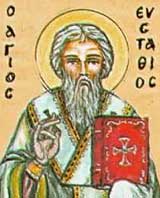 Велики ревнитељ и заштитник Православља. Као такав нарочито се истакао на I Вас. сабору где је учено и разложито побијао учење Аријево. Са осталим Светим Оцима Евстатије исповедаше правилно да је Исус Христос као Син Божји раван Оцу и Духу Светом по божанском суштатству. По смрти цара Константина аријевци опет некако добију превагу, те почну љуто гонити Православље. Св. Евстатије буде свргнут са свога престола и протеран најпре у Тракију а потом у Македонију. Страдаше много и дуго, док најзад не предаде свету душу своју Богу, 345. године.