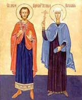 Муж и жена, обоје од племенита и богата рода из Никомидије. Адријан беше начелник претора и незнабожац, а Наталија потајна хришћанка. Обоје млади, и живљаху у браку свега 13 месеци до мучеништва. Када опаки цар Максимијан посети Никомидију, нареди да се хришћани хватају и на муке стављају. Близу града у једној пећини беху скривени 23 хришћанина. Неко их достави власти, и бише љуто шибани волујским жилама и штаповима, па онда бачени у тамницу. По том их изведоше из тамнице и доведоше претору, да им имена попише. Адријан посматраше ове људе, измученено трпељиве, мирне и кротке, па их закле, да му кажу, шта они очекују од свога Бога за толике муке претрпљене? Они му говораху о блаженству праведних у царству Божјем. Чувши то и опет посмотривши те људе Адријан се наједанпут окрете писару и рече му: „запиши и моје име са овима светима, и ја сам хришћанин!“ Када за то чу цар, упита Адријана: „да ниси с ума сишао?“ На што Адријан рече: „нисам с ума сишао него сам к уму пришао.“ Чувши за ово Наталија веома се обрадова, и када Адријан са осталим сеђаше окован у тамници, она дође и служаше им свима; а када мужа њеног шибаху и мучаху разним мукама, она га храбраше да истраје до краја. После дугих мука и тамновања нареди цар, да се однесе у тамницу наковањ, и да им се чекићем пребију и ноге и руке. То би и извршено, и Адријан са 23 чесна мужа издахну у претешким мукама. Мошти њихове пренесе Наталија у Цариград, и тамо их чесно сахрани. После неколико дана јавијој се св. Адријан сав у светлости и красоти и позва је да и она пође Богу, и она мирно предаде дух свој Богу.