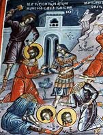 Браћа рођена, Персијанци, од оца незнабошца и мајке хришћанке. Васпитани у духу хришћанском и крштени. И као хришћани беху високи чиновници код цара Аламундара. Послати цару Јулијану Одступнику да воде преговоре и утврде мир међу царством Персијским и Грчко-римским. Цар Одступник приреди некакву светковину идолима у Халкидону. На тој светковини цар са својим велможама приносио је жртве идолима. Персијски изасланици су одсуствовали са те светковине. Цар их призове и нареди им, да и они узму учешћа у светковини и принесу жртве боговима. Онда они изјаве, да су они страни поданици, да су дошли као изасланици цара персијског ради успостављања мира међу два царства, а не због чега другог; да су хришћани, и да сматрају недостојним клањати се мртвим идолима и приносити им жртве. Цар се разјари и баци их у тамницу. Сутрадан их изведе поново и почне се с њима препирати о вери, но света браћа била су неодољива и непоколебљива.Тада их привезаше за дрвеће наге и удараху их, и стругаху железним четкама. За све време мучења они се мољаху Богу с благодардношћу за муке: „О слатки Исусе, ове су нам муке слатке због љубави Твоје!“ Ангел Божји јави им се, утеши их и одузе им сваки бол. Насупрот свима међународним односима опаки цар Јулијан најзад изрече пресуду, да се ова три брата мачем посеку. Када их посекоше, би земљотрес велики, земља се расцепи и прими тела светих мученика у себе, да их незнабошци не би сажегли по наређењу царевом. Тела мученика потом земља изврже, да би их хришћани нашли и чесно сахранили. Чувши цар персијски, како нечовечно Јулијан предаде смрти његове делегате, спреми војску против њега. А Јулијан пође на царство Персијско уверен у своју победу. Но би потучен до ногу, и сам погибе са срамом, на радост и смех целога света.