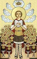 У време цара Максимијана би велико гоњење хришћана. У граду Апамији сирској Маврикије беше старешина месне војске. Незнабошци га тужише цару као хришћанина и као сејача вере хришћанске међу војницима. Сам цар дође и поведе истрагу. С Маврикијем би изведено пред цара и седамдесет војника хришћана, међу којима и син Маврикијев Фотин. Ни ласка ни претња царева не може поколебати ове јунаке. На претње цареве одговорише: „О царе, нема страха у доброумној и моћној души оних који љубе Господа!“ Када цар нареди те свукоше с њих војничке појасе и хаљине, они му рекоше: „Бог наш обући ће нас хаљинама и појасима нетрулежним, и вечном славом!“ Када их цар укореваше што су презрели част војничку, дату им од њега, они одговорише: „Чест твоја је бешчешће, јер си заборавио Бога који ти је дао царску власт!“ Тада цар нареди, те пред очима Маврикијевим посекоше му сина Фотина, да би тиме устрашио оца и остале. Но Маврикије рече: „Испунио си нашу жељу, о мучитељу, и послао си напред пред нама Фотина, војника Христова“. Тада их цар осуди на најнечовечнију смрт: одведоше их у неко блато, обнажише, привезаше за дрвеће и намазаше медом, да их комарци, осе и стршљенови изуједају. У страшним мукама предадоше душе Богу тек десетог дана и одоше да се вечно радује с ангелима светим на небу. Хришћани тајно узеше тела њихова и чесно погребоше. Ови храбри Христови војини пострадаше око 305. године.