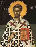 Свештеномученик Тимотеј, епископ бруски. Због велике душевне чистоте, Бог му је дао дар чудотворства, тако да је ослобађао људе болести и других мука. Исцелио је цара Арита од смртоносне болести, исцели тако и једну царицу, чак и је и обрати од таме идолопоклонства ка светлости истине Христа Бога. У време гоњења хришћана под царем Јулијаном Одступником, епископ Тимотеј није хтео да се одрекне Христа, па је осуђен и бачен у тамницу. У тамници су га посећивали верни, да би чули мудру поуку свог архипастира. Сазнавши за то, опаки цар Јулијан запрети му да више не подучава народ о имену Исусовом, а када се Свети Тимотеј оглуши о његове претње, нареди да га убију у тамници. Душу своју предаде Господу 362. године. Мошти су му чудотворне.