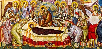 Господ који је на Синају заповедио петом заповешћу: поштуј оца свога и матер своју, показао је примером Својим, како треба поштовати родитељку своју. Висећи на крсту у мукама Он се сети Матере Своје и показујући на апостола Јована рече јој: жено, ето ти сина! Потом рече Јовану: ето ти матере! И тако збринувши Своју Мајку Он издахну. Јован имаше дом на Сиону у Јерусалиму, у који се настани и Богородица и оста да живи до краја својих дана на земљи. Својим молитвама, благим саветима, кротошћу и трпељивошћу она много помагаше апостолима Сина свога. У главноме све време до смрти провела је она у Јерусалиму обилазећи честоона места, која су је подсећала на велике догађаје и на велика дела Сина свога. Нарочито је често походила Голготу, Витлејем и гору Јелеонску. Од њених дужих путовања помиње се њена посета св. Игњатију Богоносцу у Антиохији, посета св. Лазару четвородневном, епископу Кипарском, посета Св. Гори коју је она благословила, и бављење у Ефесу са св. Јованом за време великог гоњења хришћана у Јерусалиму. У својој старости она се често молила Господу и Богу своме на Јелеонској гори, на месту Вазнесења Његова, да је што пре узме из овога света. Једном приликом јави јој се архангел Гаврил, и објави јој, да ће кроз три дана бити упокојена. И даде јој ангел Божји једну грану палмову, која ће се носити при њеном спроводу. С великом радошћу она се врати дома пожелевши у срцу, да још једанпут у овом животу види све апостоле Христове. Господ јој испуни ову жељу, и сви апостоли, ношени ангелима и облацима, наједанпут се сабрашеу дом Јованов на Сиону. Са великом радошћу виде она свете апостоле, охрабри их, посаветова и утеши; по том мирно предадедух свој Богу без икакве муке и болести телесне. Апостоли узеше ковчег с телом њеним, од кога излазаше ароматни мирис, и у пратњи мноштва хришћана пренеше у врт Гетсимански у гробницу св. Јоакима и Ане. Од злобних Јевреја заклањаше их облак по промислу Божјем. Неки свештеник јеврејски, Атоније, дохвати рукама ковчег у намери да га претури, али у том часу ангел Божји одсече му обе руке. Тада он завапи апостолима запомоћ, и би исцељен пошто изјави своју веру у Господа Исуса Христа. Апостол Тома беше изостао, опет по Божјем Промислу, да бисе тако опет открила једна нова и преславна тајна о Светој Богородици. Трећег дана стиже и он, и пожели да целива тело Свете Пречисте. Но када апостоли отворише гроб, нађоше само плаштаницу, а тела не беше у гробу. Тога вечера она се јави апостолима, – мноштвом ангела окружена, и рече им: „радујте се, ја ћу бити с вама навек.“ Не зна се тачно, колико стара беше Богородица у време успенија свога, али преовлађује мишљење, да је била прешла 60 година свога земног века.